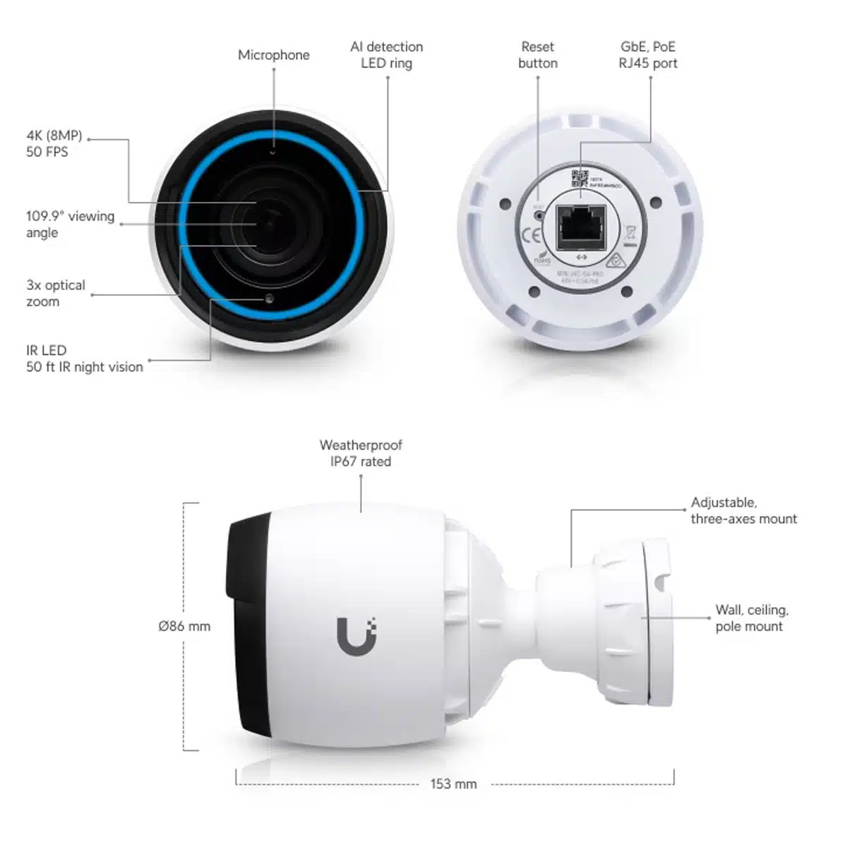See Every Detail in 4K Brilliance Elevate your security with the UniFi GF Professional, featuring a cutting-edge 4K night-vision camera designed for long-range, indoor and outdoor surveillance. With a stunning 8MP resolution, 3x optical zoom, and AI event detections, this camera ensures crystal-clear footage. Experience peace of mind with 15m (50 ft) IR night vision, audio recording, and seamless connectivity via PoE. Weatherproof and easy to install, this camera is your ultimate choice for robust surveillance. The Ubiquiti Extended Warranty - 3 Years Extended Advance Replacement ensures you enjoy peace of mind, confident that your Ubiquiti equipment will always be taken care of, promptly and efficiently.