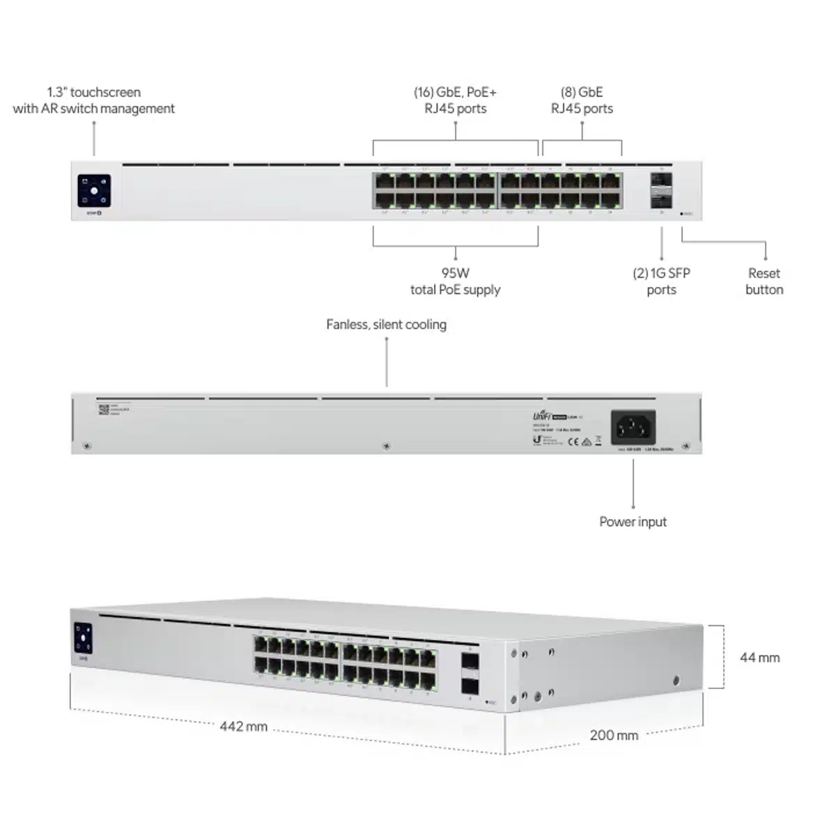 Experience the next level of network management with the Ubiquiti UniFi Standard 24 Power-Over-Ethernet. This robust Layer 2 switch comes equipped with 24 ports, including 16 GbE PoE+ and 8 GbE ports, complemented by 2 1G SFP ports for expanded connectivity. It's the ideal solution for businesses seeking a powerful yet quiet networking solution, offering 95W total PoE availability to power devices such as VoIP phones, cameras, and access points. The fanless design of the USW-24-POE ensures silent operation, making it perfect for noise-sensitive environments such as offices or libraries. With its compact size, it easily fits into SOHO rack cabinets, streamlining your network setup without taking up excess space. The UniFi Standard 24 PoE isn’t just about providing power; it’s about giving you control. Managed and configured via the UniFi Network Controller and supported by the UniFi mobile app, this switch offers an extensive suite of advanced Layer 2 switching protocols and features. Customize your network with operation modes per port, including switching, mirroring, or aggregate, all accessible through a user-friendly interface. The switch also features a 1.3" touch LCM for convenient status monitoring. Whether you're upgrading an existing network or building a new one, the UniFi Standard 24 PoE delivers the reliability, control, and performance you need to keep your network running smoothly. The Ubiquiti Extended Warranty - 3 Years Extended Advance Replacement ensures you enjoy peace of mind, confident that your Ubiquiti equipment will always be taken care of, promptly and efficiently.