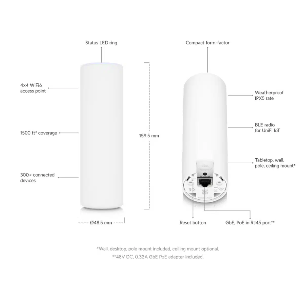 Embrace the future of wireless networking with the Ubiquiti UniFi U6 Mesh, a sleek, WiFi 6 access point expertly designed for both indoor and outdoor mesh applications. This powerful device offers an impressive 140 m² (1,500 ft²) coverage area and can support over 300 connected devices simultaneously, ensuring a robust and seamless online experience. Featuring advanced WiFi6 technology with 4x4 MIMO, the U6 Mesh delivers a high-performance network solution, capable of reaching an aggregate throughput rate of up to 5.3 Gbps. This is achieved through its dual-band capabilities, with the 5 GHz band supporting 4x4 MU-MIMO and OFDMA for a 4.8 Gbps throughput rate, and the 2.4 GHz band offering a 573.5 Mbps throughput rate. Its compact form factor offers versatile mounting options, including tabletop, wall, or pole placements, making it a perfect fit for any environment.   The UniFi U6 Mesh is more than just an access point; it's a testament to versatile and durable design. With an IPX5-rated, weatherproof housing, it is equipped to handle outdoor conditions, ensuring reliable performance wherever it's placed. Additionally, the device operates at full 4x4 MIMO with 160 MHz channels, facilitating high-capacity wireless uplinks and faster data transfer. Setup is a breeze, thanks to its plug-and-play nature, and it can be fully managed with the UniFi Network web application or mobile app. Whether expanding your home Wi-Fi network or enhancing enterprise connectivity, the UniFi U6 Mesh provides the coverage, speed, and reliability you need.